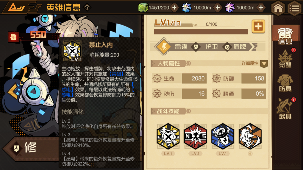技能介绍:每过5秒,赋予自身数层【感电】效果,其数量等同于修附近的敌人数量。同时,每层【感电】效果额外为修提供2%的防御力