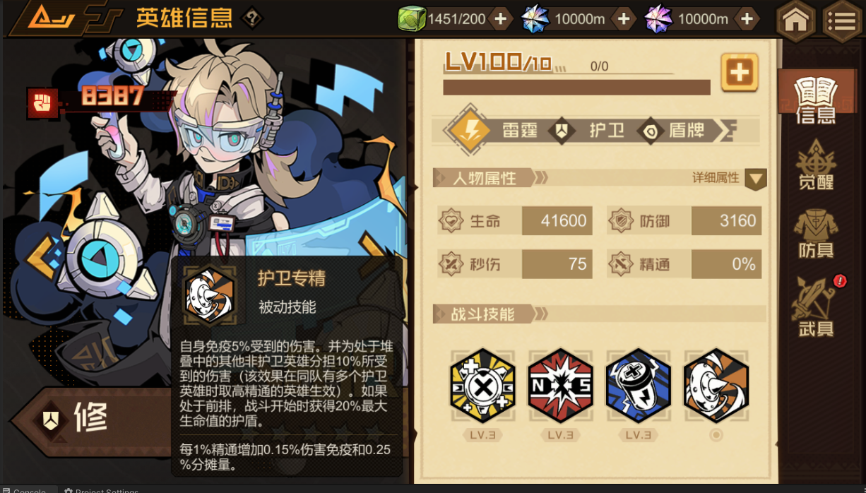 技能介绍:自身免疫5%受到的伤害。并为处于堆叠中的其他非护卫英雄分担10%所受到的伤害(该效果在同队有多个护卫英雄时取高精通的英雄生效)。如果处于前排,战斗开始时获得20%最大生命值的护盾