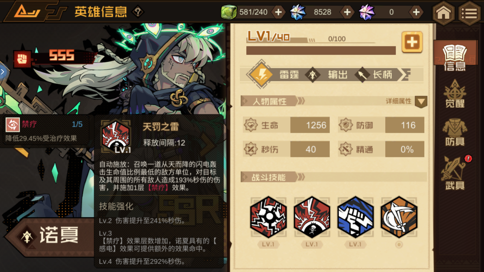 技能介绍:召唤一道从天而降的闪电轰击生命值比例最低的敌方单位,对目标及其周围的所有敌人造成193%秒伤的伤害,并施加1层【禁疗】效果