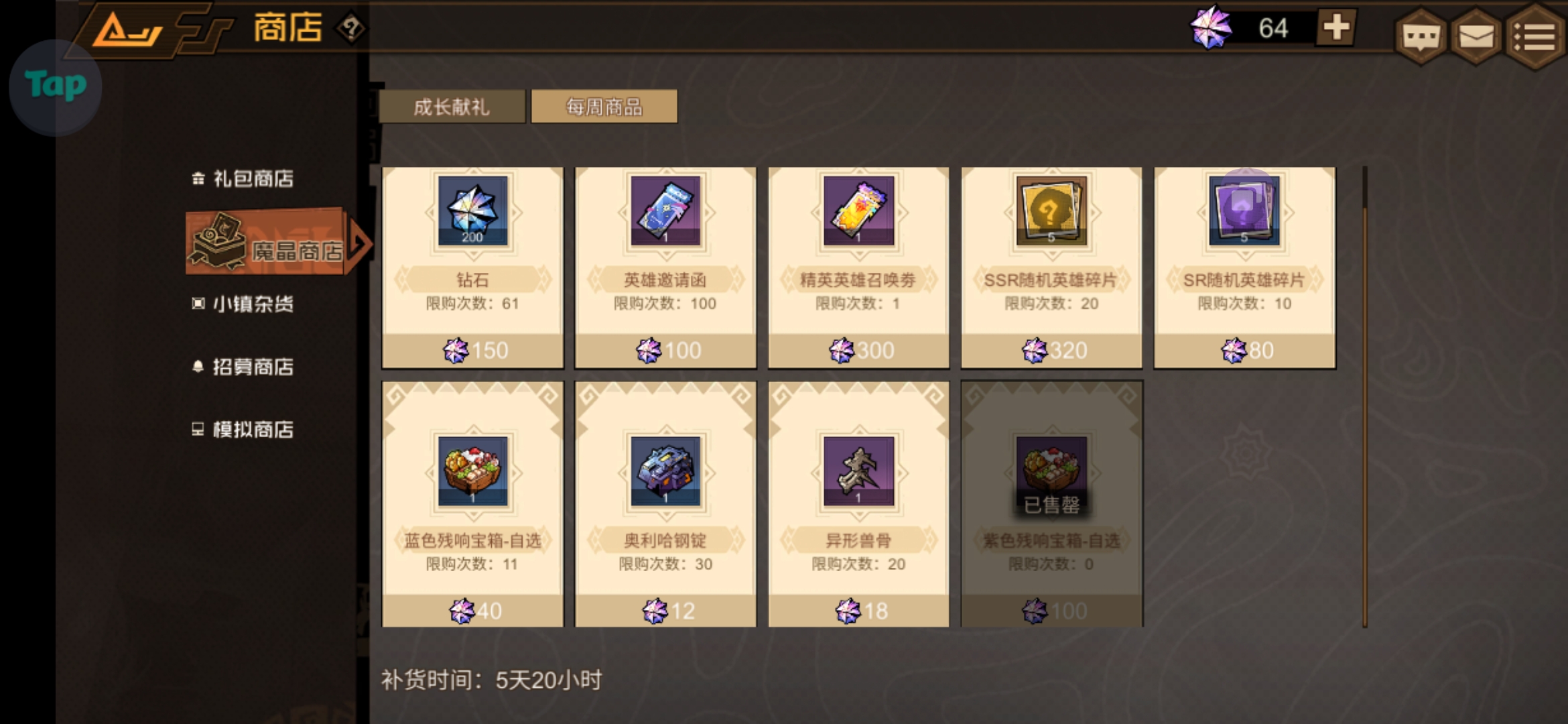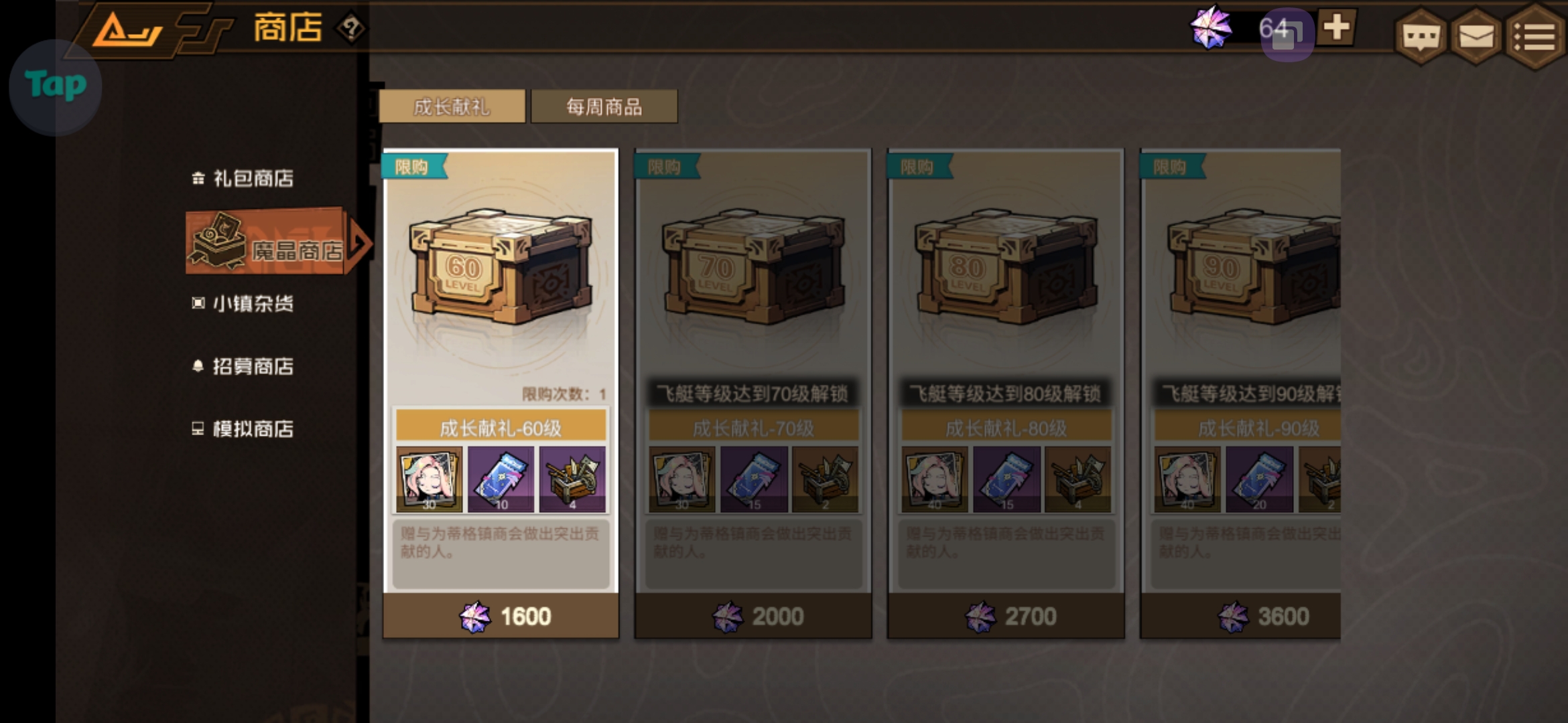 魔晶商店:魔晶兑换钻石,后期体力用钻石购买200-200体力,后期体力消耗巨大,后面各项资源图体力成倍上涨。体力包可购买。