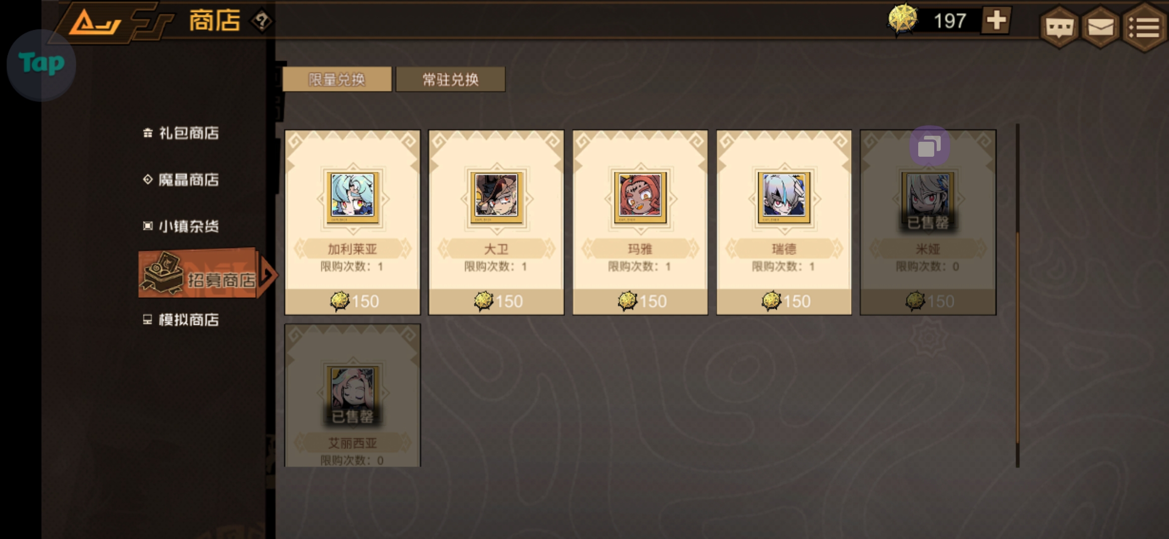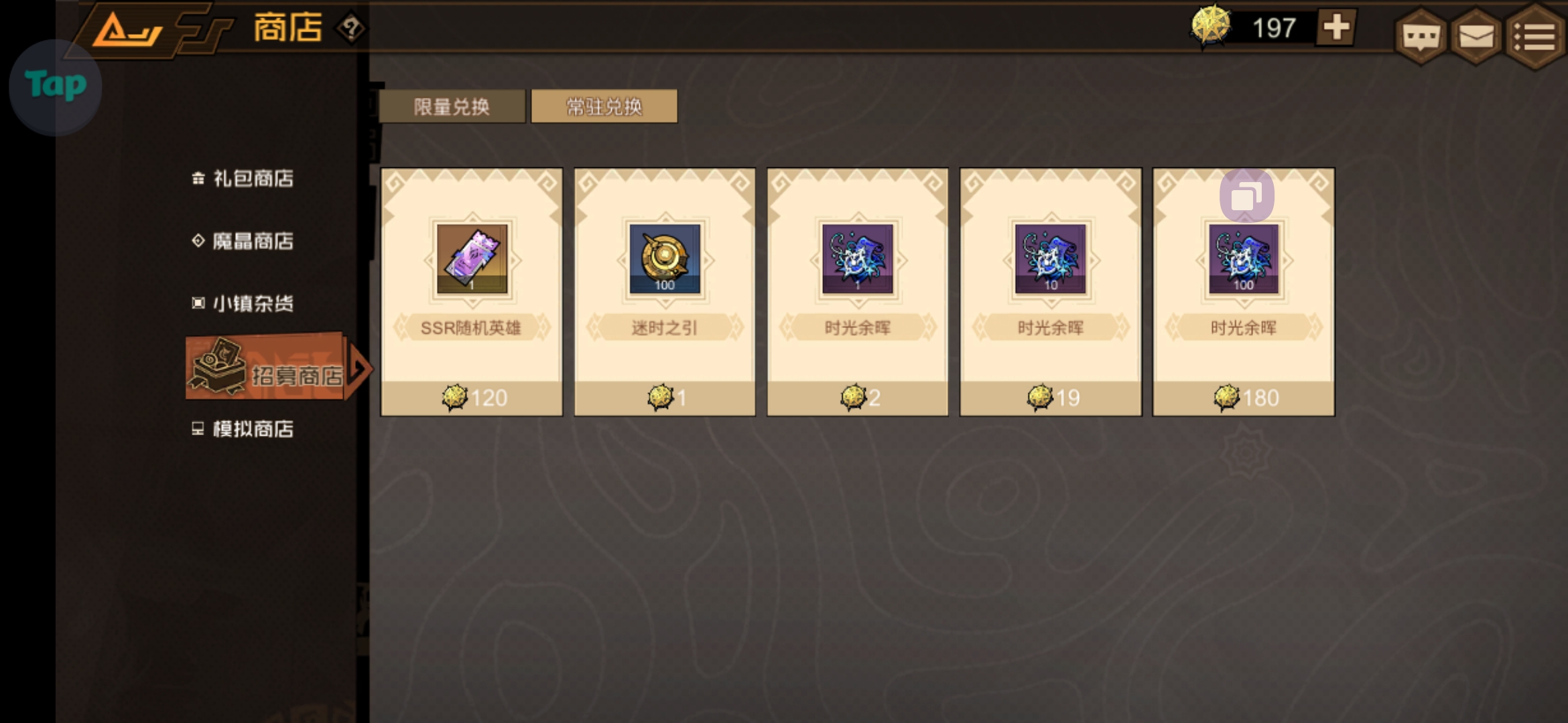 招募商店:一次性:除了兑换前期米娅及艾丽西亚。建议不要兑换看下图后期迷时之引和时光余晖要用,时光余晖建议兑换180币的。