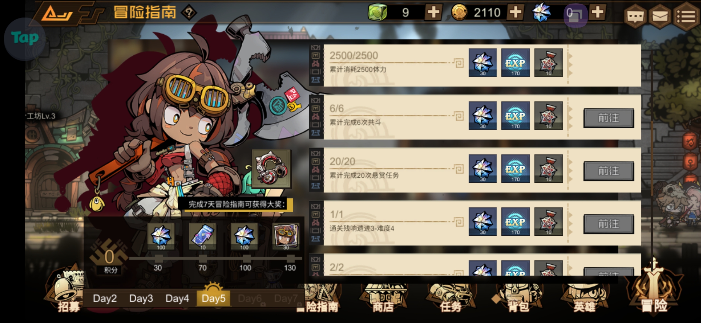 新人开篇只要每天跟着《冒险指南》及任务来做,这是最快升级经验最多的。每天记得做完哦!因为指南一天开一次,跟上节奏,也可以提前做完。加上不乱抽卡,乱选英雄卡组英雄配合不了达不到各种技能效果,导致战力低卡关、等级卡下一个章等问题,重点说明:等级很重要,关系到你下一步的开启。下图就是我提前昨晚的有显示,只能等明天了。