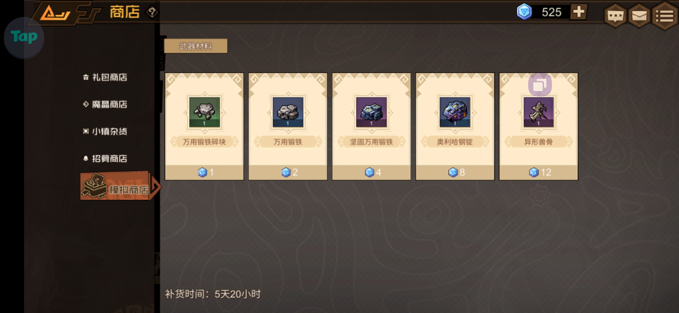 模拟商店:这个商店按需求兑换。因为做武器需要这些材料,消耗钻石和虚拟币兑换也是巨大。因为武器需要用钻石配合材料研究。