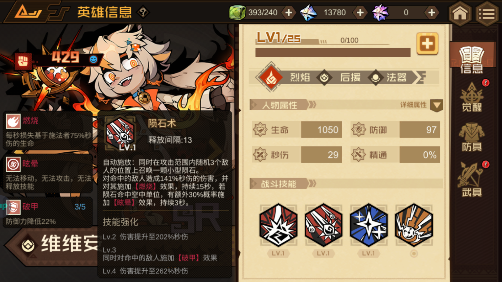 技能介绍:同时在攻击范围内随机3个敌人的位置上召唤一颗小型陨石。对命中的敌人造成141%秒伤的伤害,并对其施加【燃烧】效果,持续15秒,若陨石命中空中单位,有额外30%概率施加【晕眩】效果,持续3秒
