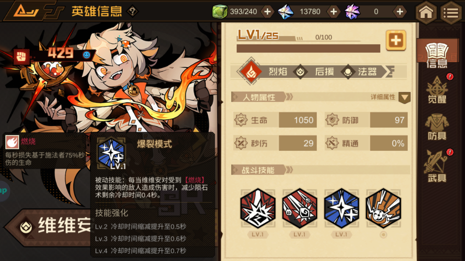 技能强化:Lv.2 伤害提升至202%秒伤;Lv.3 同时对命中的敌人施加【破甲】效果;Lv.4 伤害提升至262%秒伤