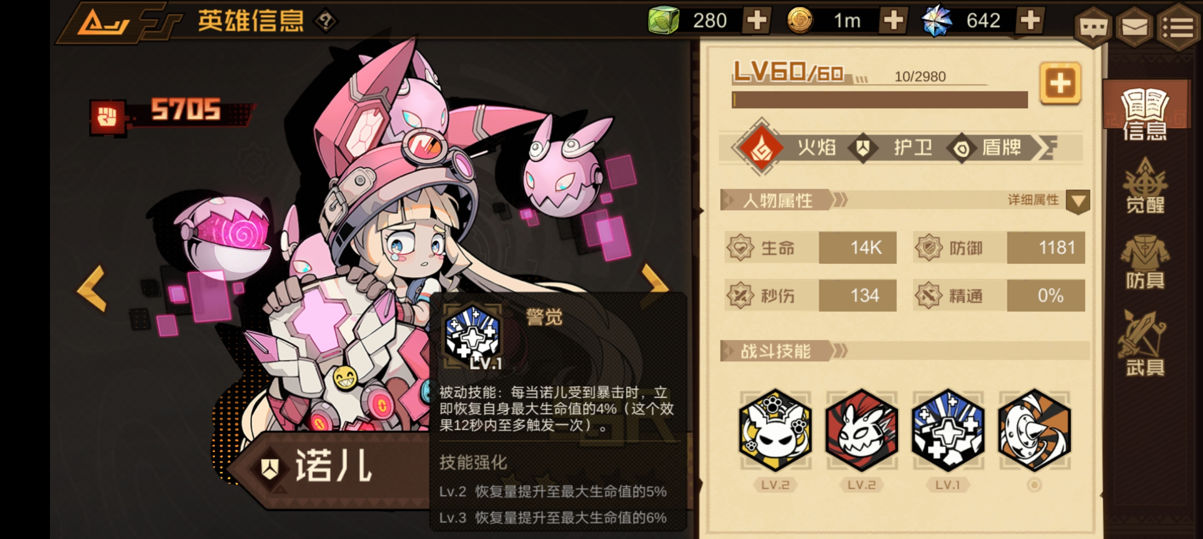 技能介绍:主动施放:巨大化兔子盾牌,并躲在盾牌之后4秒,持续期间诺儿处于无敌状态,并持续恢复最大生命值37%的生命