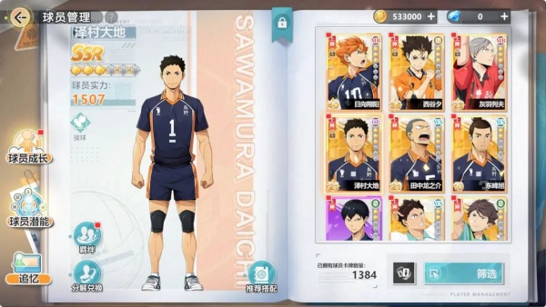 1、乌野高中的球员属于SSR级别,有着1507的实力是强攻属性角色。