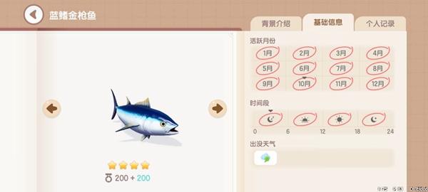 鲣鱼:获取地点,地图上的所有海域均可钓到。获取时间,全天0~24。
