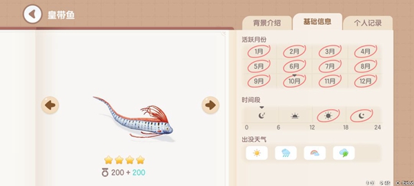 皇带鱼:获取地点,海钓派对可钓到(大金色)。获取时间,12~24。