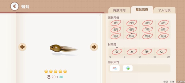 蝌蚪:获取地点,地图上的所有湖中均可钓到。获取时间,彩虹天和幸运天0~24。