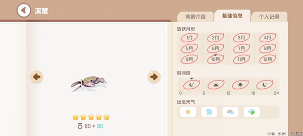 溪蟹:获取地点,地图上的所有湖中均可钓到。获取时间,全天0~24。