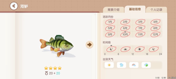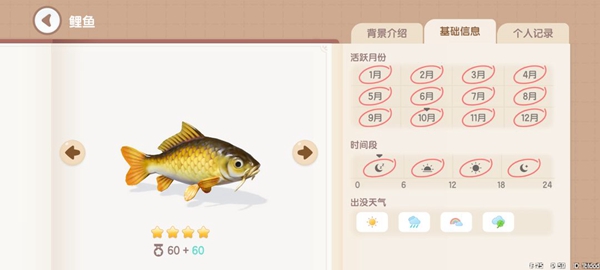 鲤鱼:获取地点,地图上的所有河中均可钓到。获取时间,全天0~24。