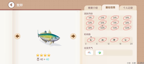 鲭鱼:获取地点,地图上码头钓点可钓到。获取时间,全天0~24。
