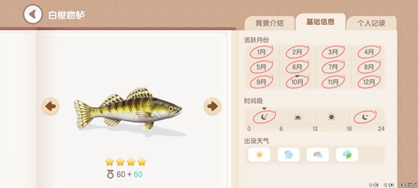 白梭吻鲈:获取地点,地图上的所有问河中均可钓到。获取时间,18~06。