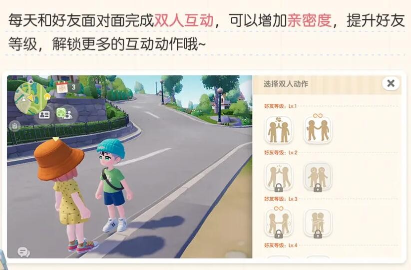 每天和好友面对面完成双人互动,可以增加亲密度,提升好友等级,解锁更多的互动动作哦~