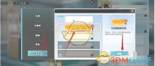 3、最后在个人信息页面,点击聊天框,选择新的聊天框点击更换即可;