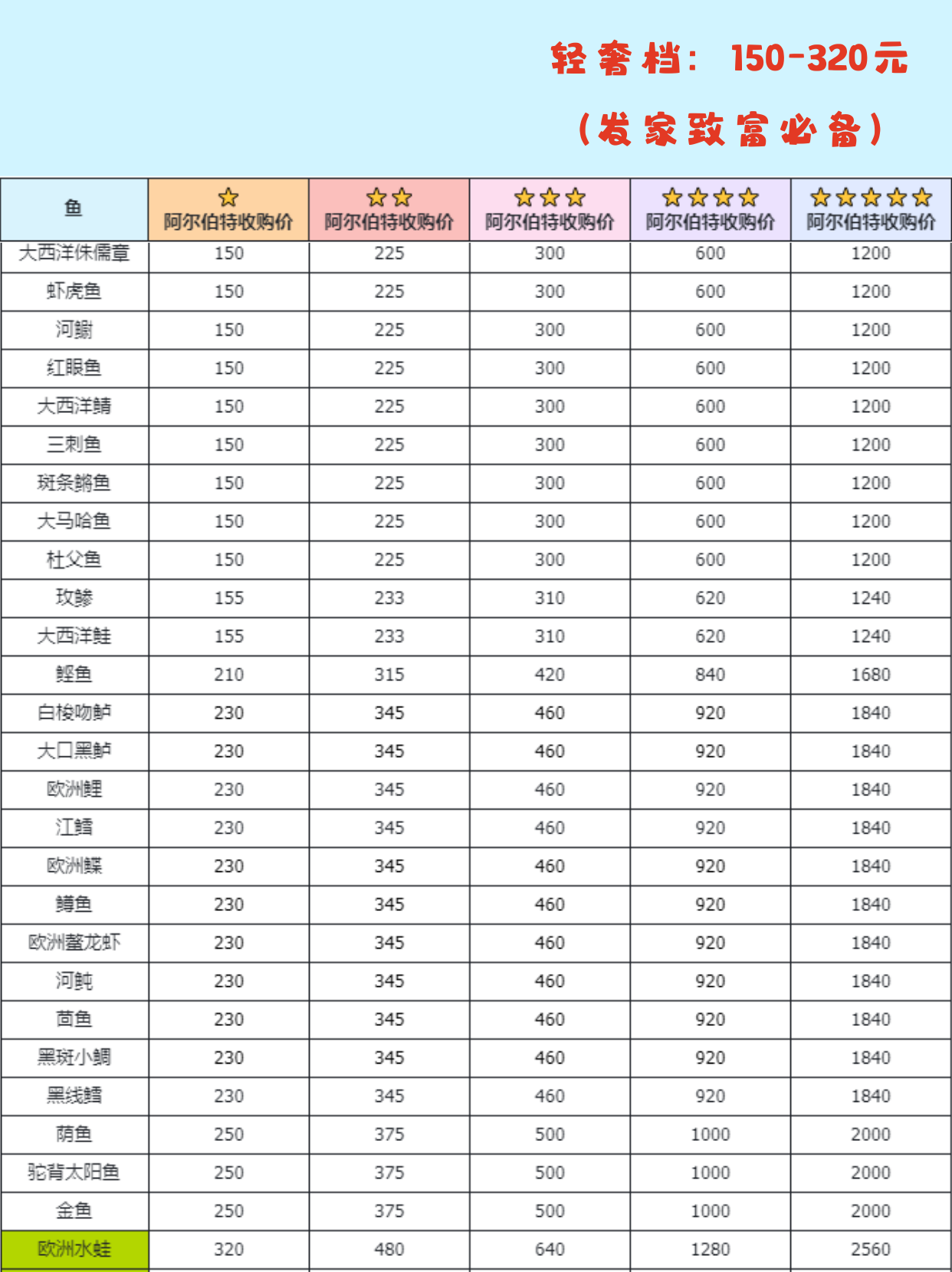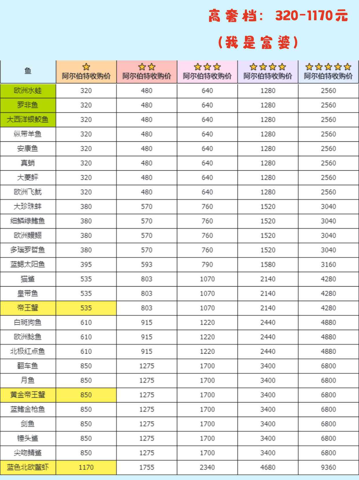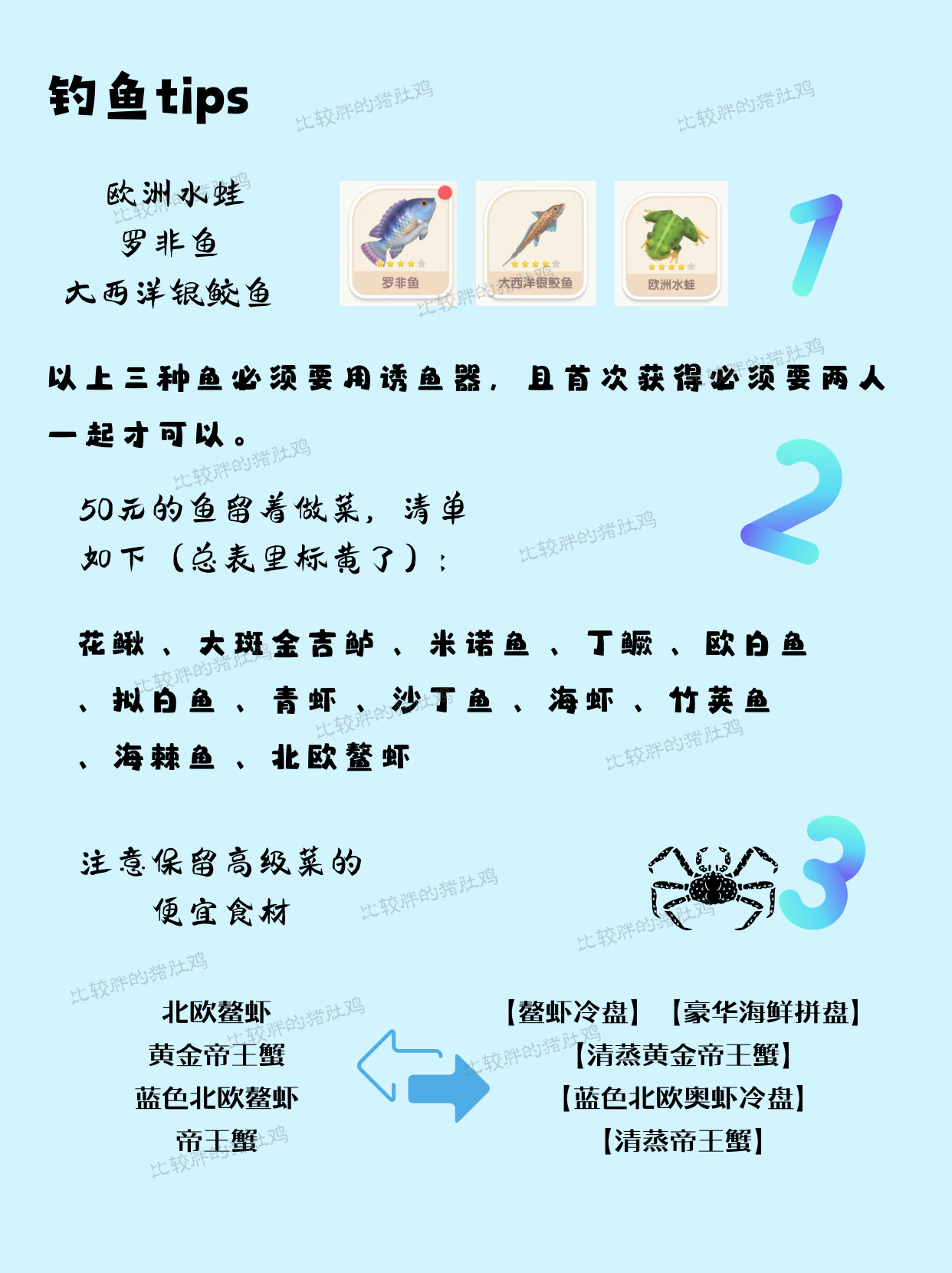 重要tips:1.花鳅 、大斑金吉鲈 、米诺鱼 、丁鳜 、欧白鱼 、拟白鱼 、青虾 、沙丁鱼 、海虾 、竹荚鱼 、海棘鱼 、北欧鳌虾 一⭐是50块的留着做菜