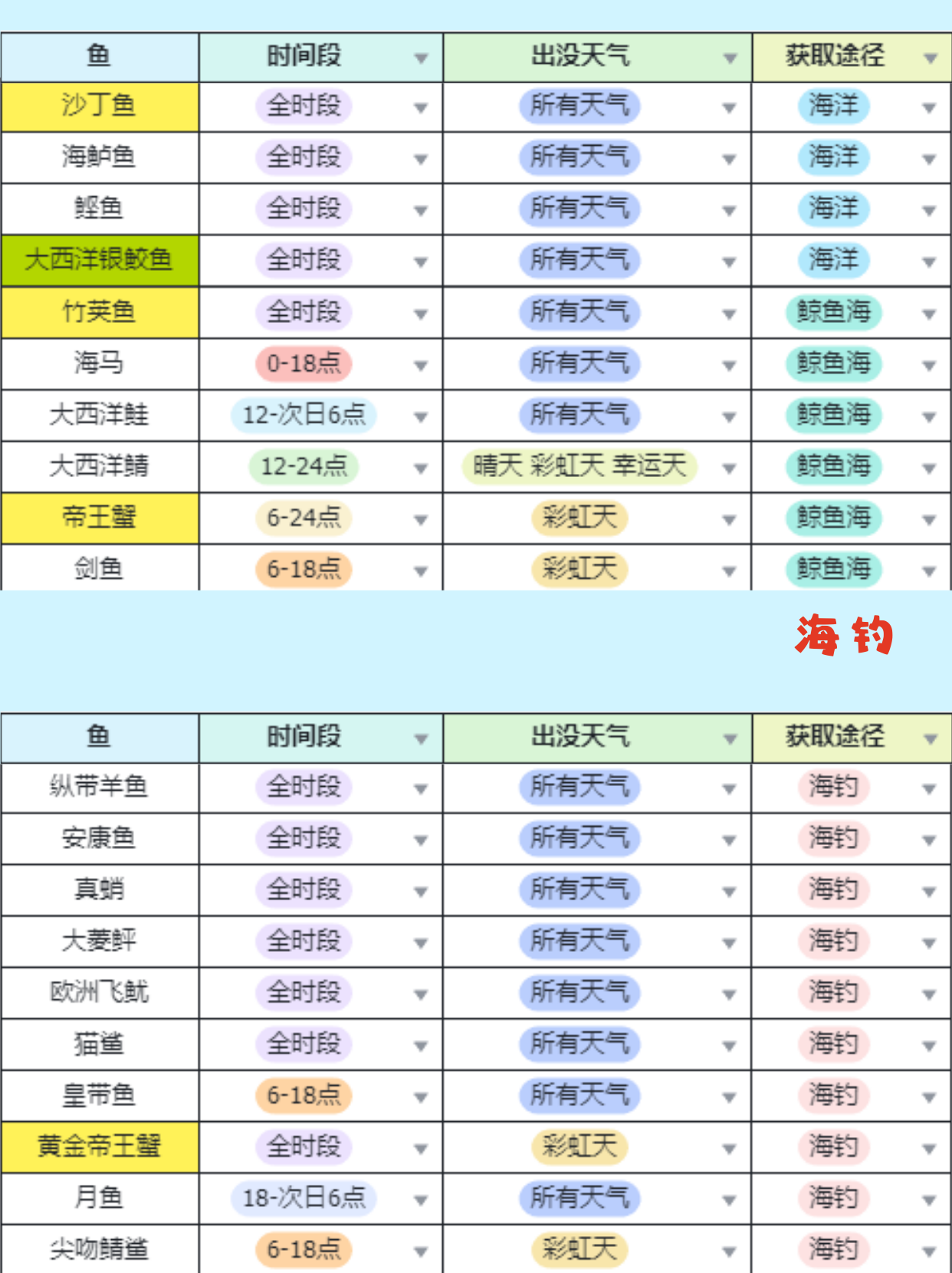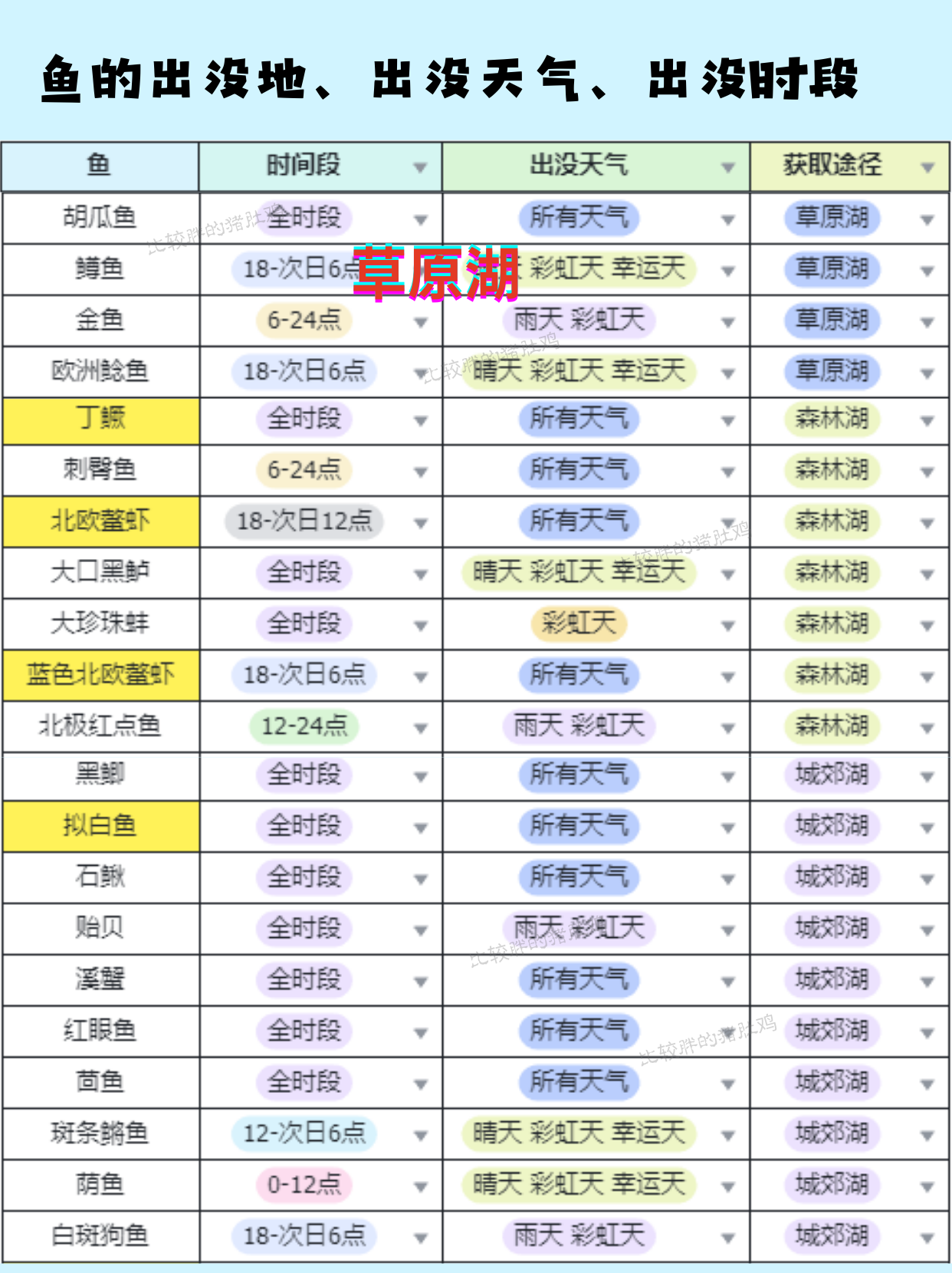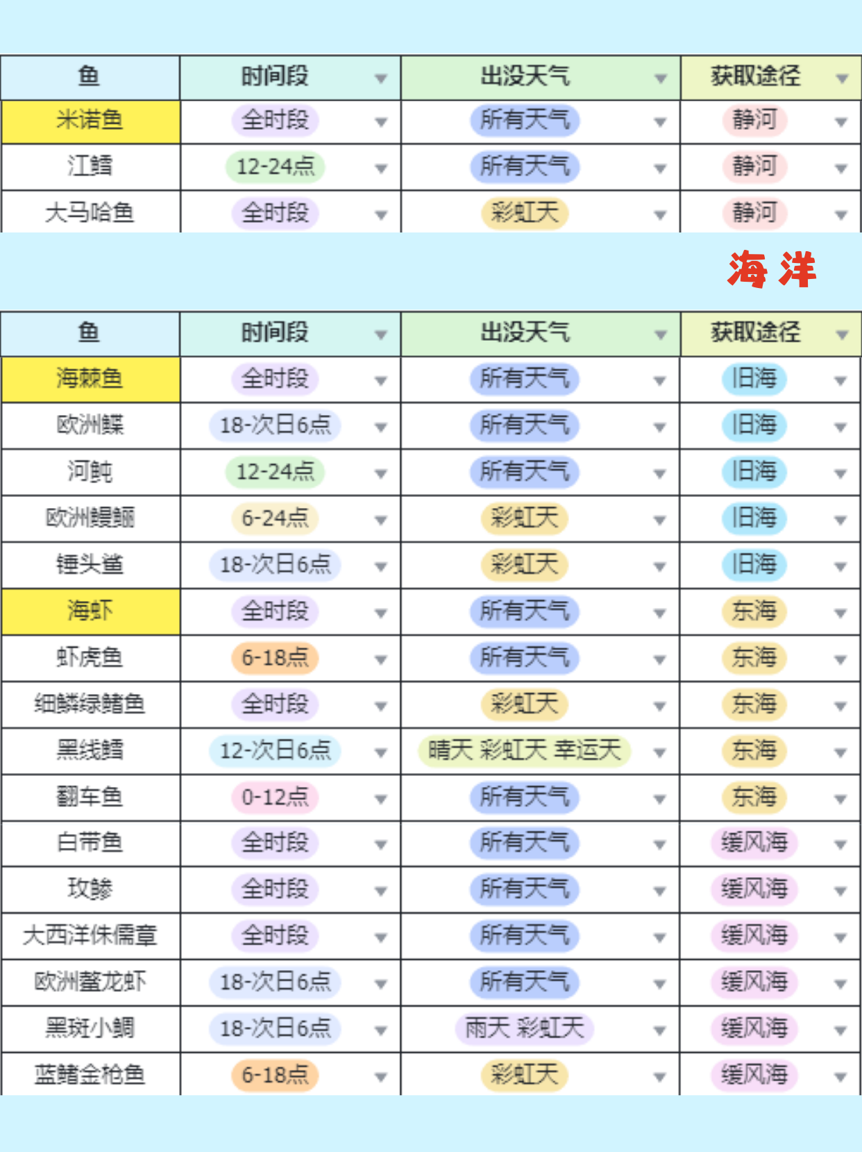 重要tips:1.花鳅 、大斑金吉鲈 、米诺鱼 、丁鳜 、欧白鱼 、拟白鱼 、青虾 、沙丁鱼 、海虾 、竹荚鱼 、海棘鱼 、北欧鳌虾 一⭐是50块的留着做菜