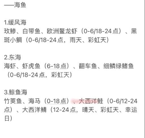 竹荚鱼、海马(0-18点) 、大西洋鲑(0-6/12-24点)、大西洋鲭(12-24点,晴天、彩虹天、幸运日)