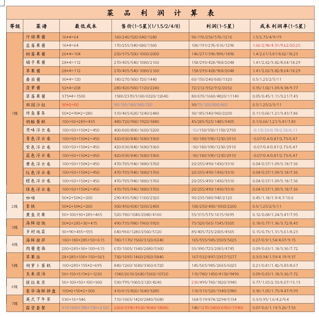 1、所有二次加工的食物成本按食谱内食物的售价计算,如海鲜披萨原料包含番茄酱,其成本计算时取番茄酱售价而非四个番茄的售价;