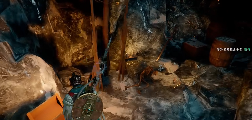 下来之后,即可发现一个宝箱,这是获取目标道具的最后一步。靠近宝箱并进行互动开启,即可直接获得冰冷黑暗板金手套。