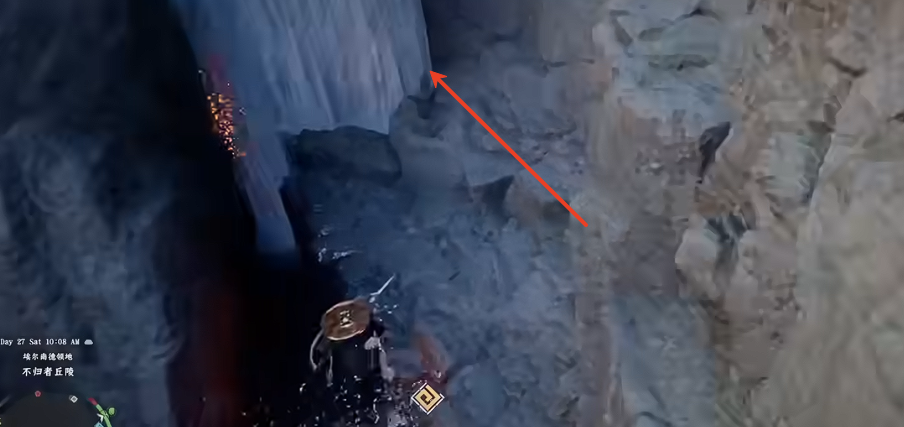 站在瀑布前,对准水流缝隙,使用刺击技能穿过瀑布,进入隐藏洞穴。
