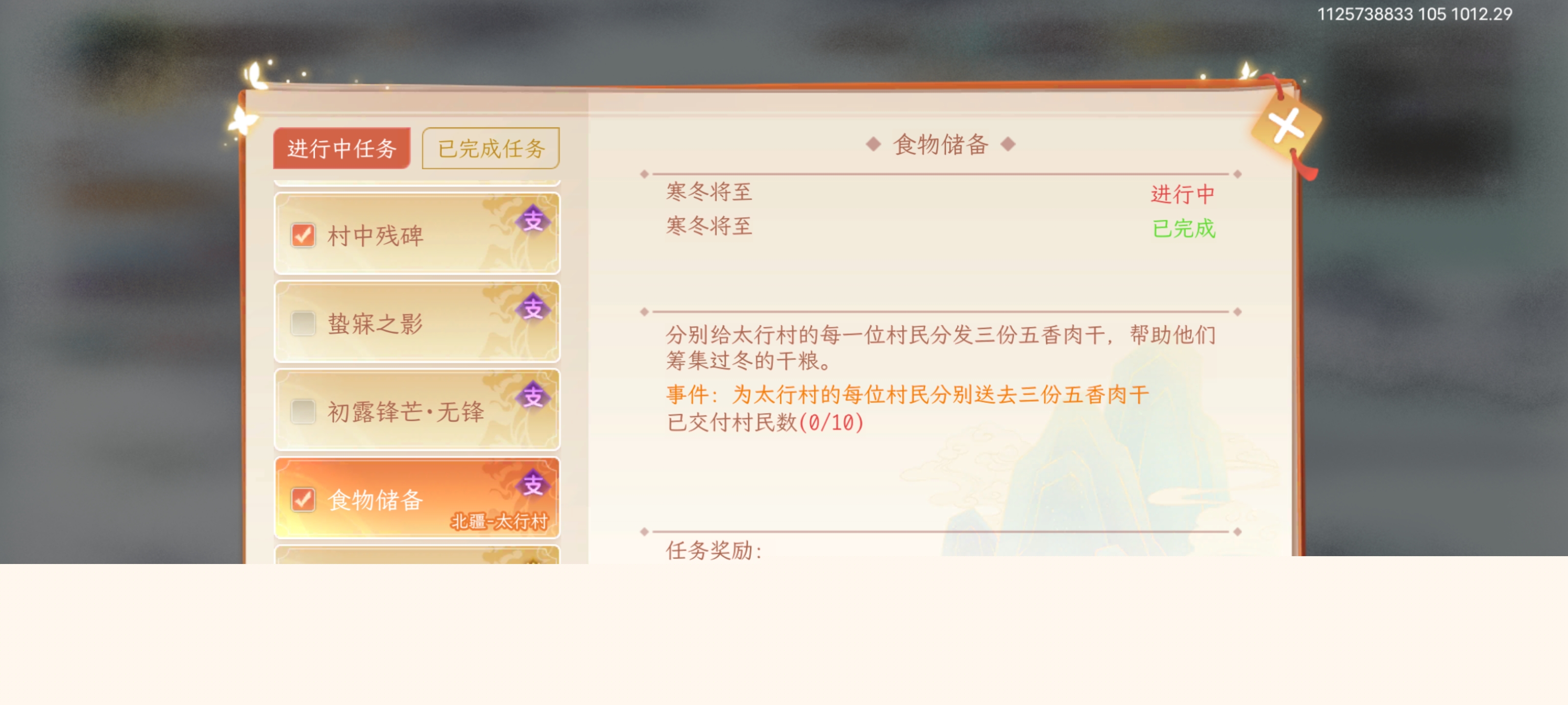 事件:为太行村的每位村民分别送去三份五香肉干已交付村民数(0/10)