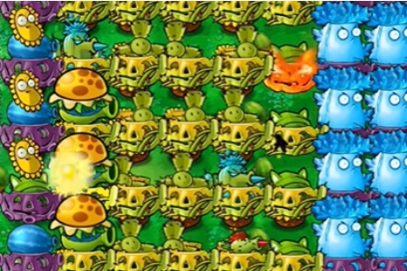 2、仙人三叶草阵容:右侧种植两排寒冰高坚果,中间种植西瓜猫蒲, 这样能够快速击败敌人。