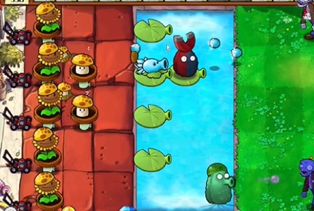 2、先种植一列阳光向日葵,在水池中种植多个豌豆睡莲,在睡莲上种植一个寒冰香蒲和一个磁力坚果。