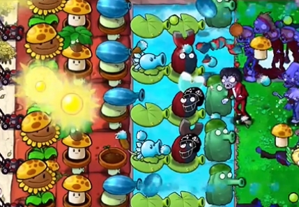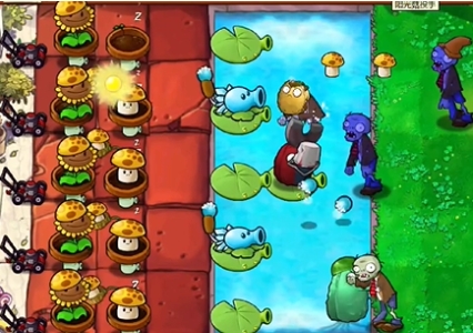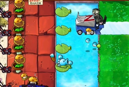 2、先在左侧种植一列阳光向日葵和一列小盆菇,在泳池中种植四个豌豆睡莲和一个寒冰香蒲。