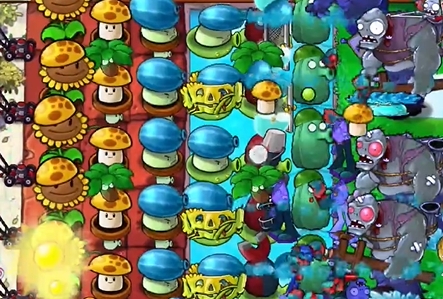 5、最后在瓦片上补齐两列冰冻西瓜大喷菇,在泳池中继续补充磁力坚果和高兵菇就可以轻松过关了。