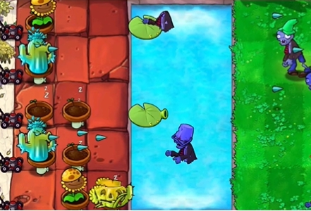 2、先在最左侧种植一个阳光向日葵和两个寒冰仙人掌,在泳池中种植两个睡莲。