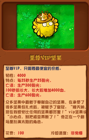 植物大战僵尸杂交版至尊vip坚果怎么样?植物大战僵尸杂交版至尊vip坚果是一个金卡植物,在防御和功能方面都非常的出色,别看他只有这么小一只,但是会不断地长大为玩家提供高额的太阳以及防御能力,下面为大家带来杂交版至尊vip坚果介绍。
