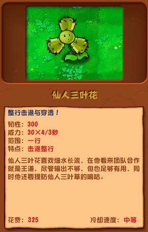 以上就是小编整理带来的植物大战僵尸杂交版仙人三叶花介绍,更多相关游戏攻略,请关注手游网!