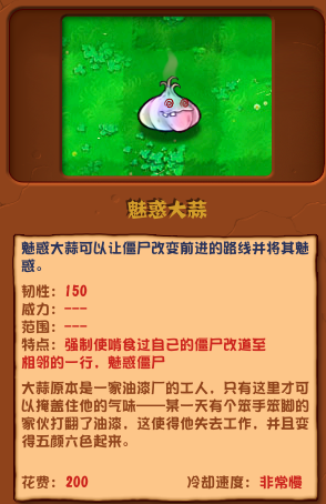 魅惑大蒜可以让僵尸改变前进的路线并将其魅惑。