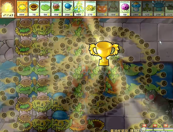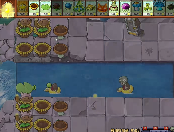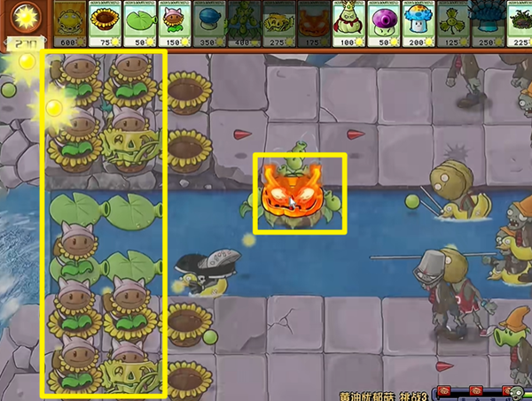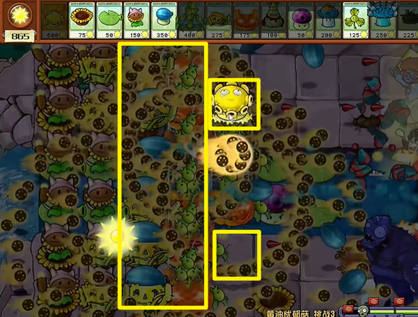 1、第一次闪屏幕我们把左边两列的小喷菇都铲掉,用最快的手速去把阳光花盆和向日葵猫蒲种起来。
