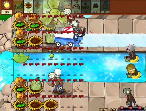 3、阳光向日葵的数量足够之后,我们就去建造一个豌豆喷泉和火南瓜的组合,同时也可以开始放置我们的豌豆大炮。