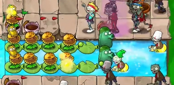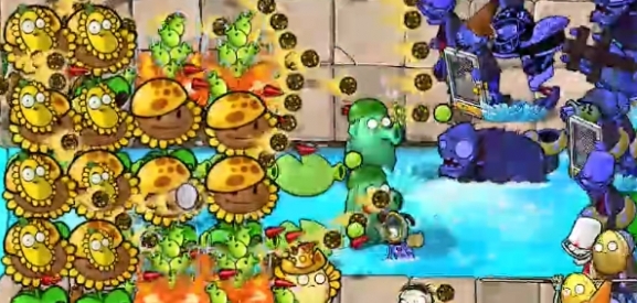 5、最后在水池中种植四个豌豆许愿池和四个火焰南瓜头即可过关。