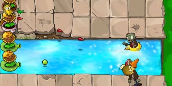 3、继续在水池中种植两排阳光向日葵,在水池外面种植两个海兵菇。