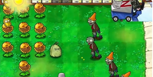 2、先在左侧上三路种植多个阳光向日葵,在三路和五路种植两个窝瓜坚果。