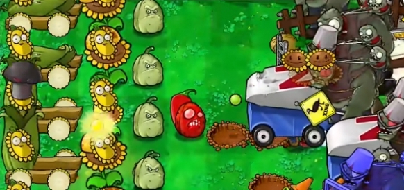 4、将上方的阳光向日葵都铲除,补齐一排毁灭加农炮。