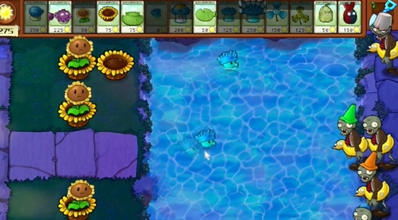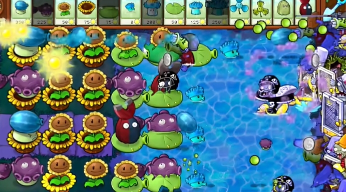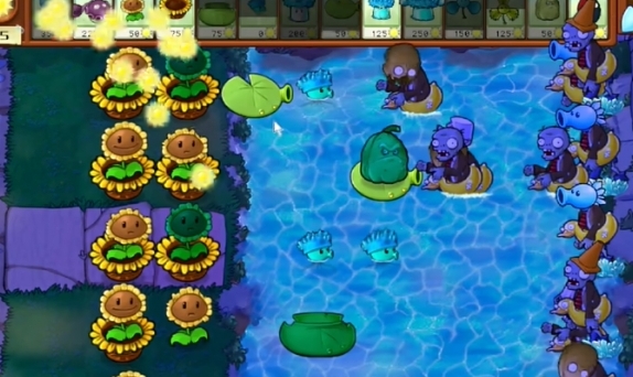 2、先在左侧种植多个向日葵花盆和损坏的向日葵,在右侧水池中种植寒冰海兵菇。
