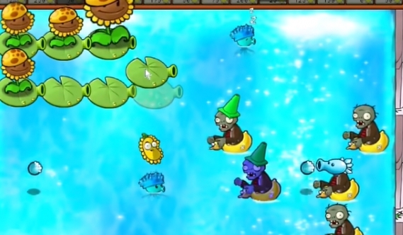 2、先在上方种植两排阳光向日葵,在僵尸所在排种植一个寒冰喷菇。