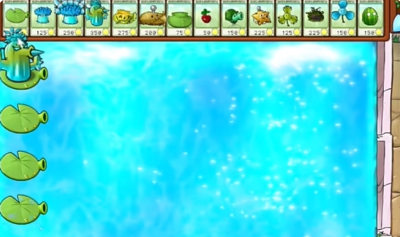 2、先在最里侧种植一列豌豆荷叶和一列寒冰仙人掌。