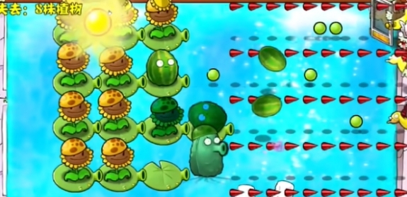 7、最后在最左侧补充一列寒冰仙人掌,在外侧补充多个坚果即可过关。