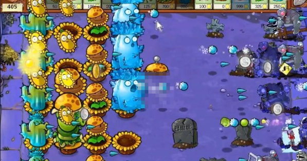 4、能量足够了后面一排就种植满寒冰仙人掌,前面可以放一些汉堡射手。