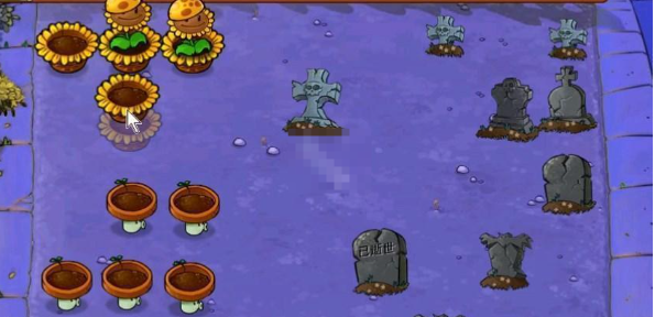1、植物大战僵尸杂交版挑战模式第40关这一关是黑夜模式,给我们赠送了很多的小盆菇,先铲掉一部分小盆菇种植阳光花盆然后种植阳光向日葵。