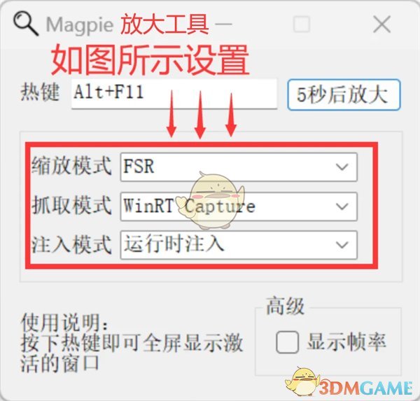 使用方法:设置缩放模式为FSR、抓取模式为WinRT Capture、注入模式为运行时注入
