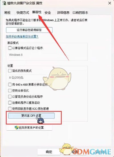 2、打开属性界面后,在上方的导航中选择【兼容性】-【更改高DPI设置】