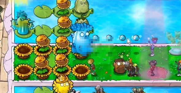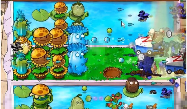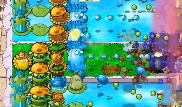 2、在水池里面放豌豆睡莲,睡莲上面后面放寒冰仙人掌,前面放至尊vip坚果。